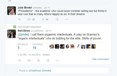 Neologisms like 'prickademics' and 'orgasmic intellectuals' are just further examples of ersatz Marxist-Leninist dinosaurs like Bindel and Dines resorting to something close to chimp tactics, in order to try to leverage a little unearned power for themselves, by smearing anyone who agrees with their expressed views on sex work and porn. And Dines is being particularly hypocritical, in that she (along with Bindel) does the dirty work of that section of the elite which is currently attempting to curb civil liberties re sex work, porn and other forms of adult entertainment; one might even go as far as to describe her as a shill for religious fundamentalists and political conservatives, given the relatively long history of alliances between them and the radfems.